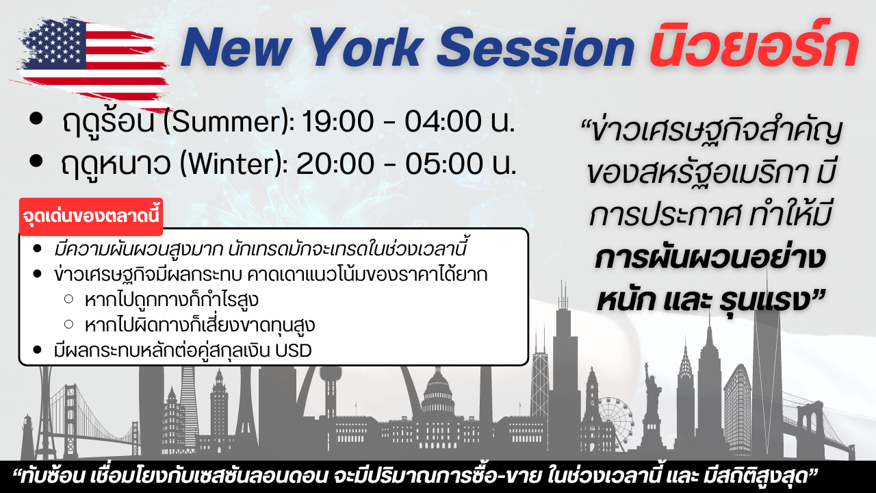 รูปที่ 5: อธิบายถึงเวลาของตลาด นิวยอร์ก พร้อมประเด็นสำคัญ และ จุดเด่นของช่วงเวลา