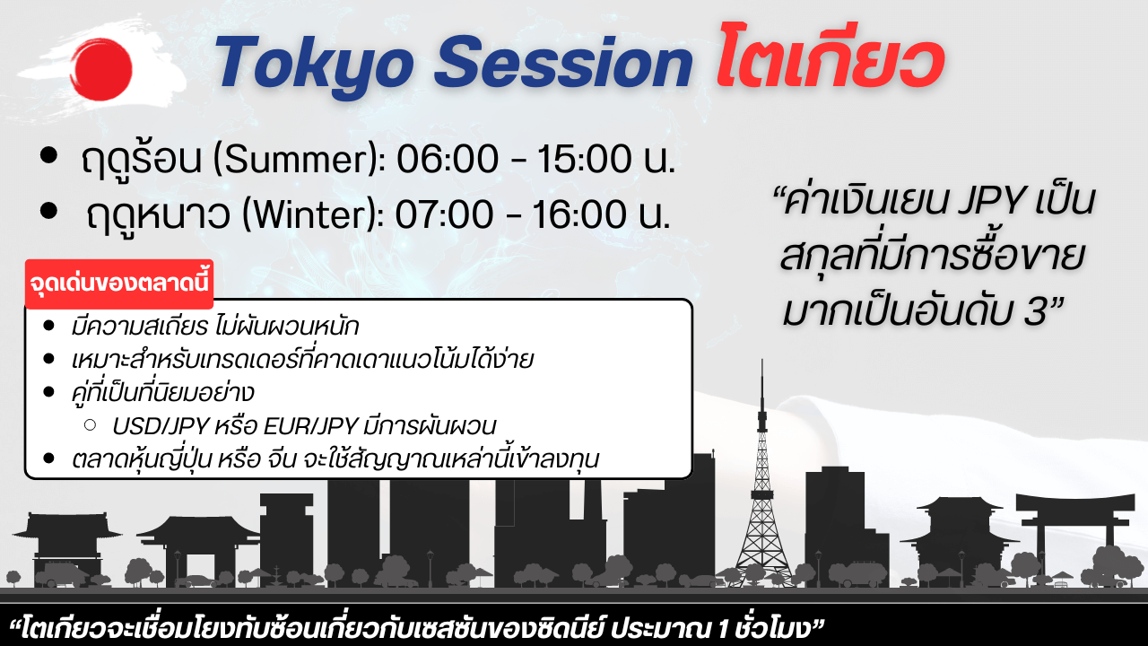 รูปที่ 3: อธิบายถึงเวลาของตลาด โตเกียว-ญี่ปุ่น พร้อมประเด็นสำคัญ และ จุดเด่นของช่วงเวลานี้