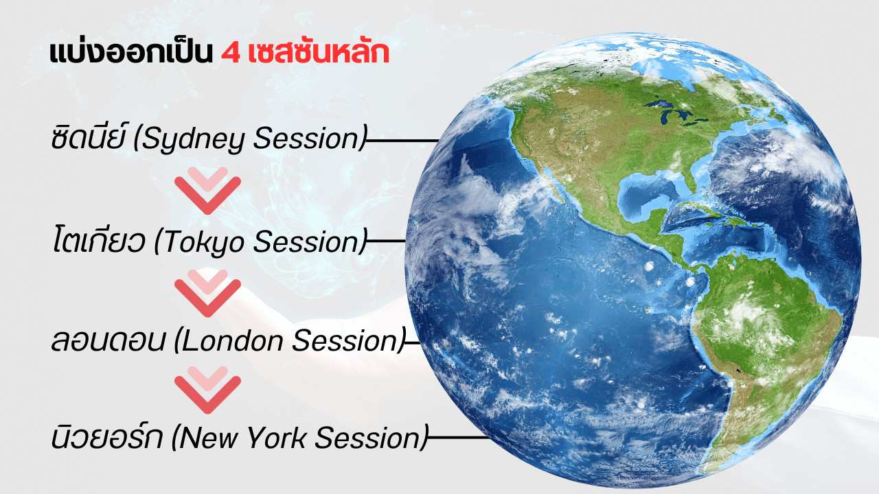 ตลาด Forex นั้นทำการเปิดตลอด 24 ชั่วโมง ตั้งแต่วันจันทร์ถึงวันศุกร์ โดยจะแบ่งออกเป็น 4 เซสซันหลักดังนี้