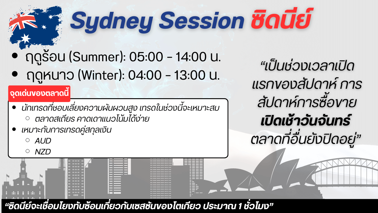 รูปที่ 2: อธิบายถึงเวลาของตลาด ซิดนีย์ พร้อมประเด็นสำคัญ และ จุดเด่นของช่วงเวลานี้