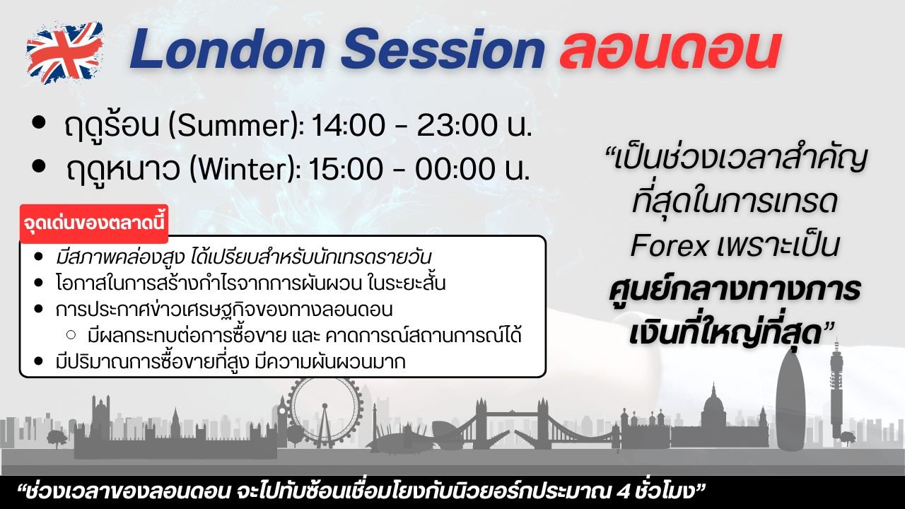 รูปที่ 4: อธิบายถึงเวลาของตลาด ลอนดอน-ยุโรป พร้อมประเด็นสำคัญ และ จุดเด่นของช่วงเวลานี้